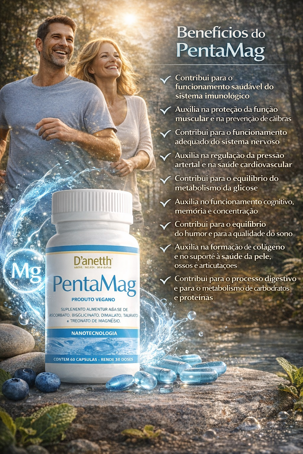 O PentaMag é um suplemento alimentar desenvolvido com um blend exclusivo de cinco formas de magnésio altamente biodisponíveis, formulado para contribuir com o equilíbrio metabólico, o funcionamento muscular e o suporte ao sistema nervoso.