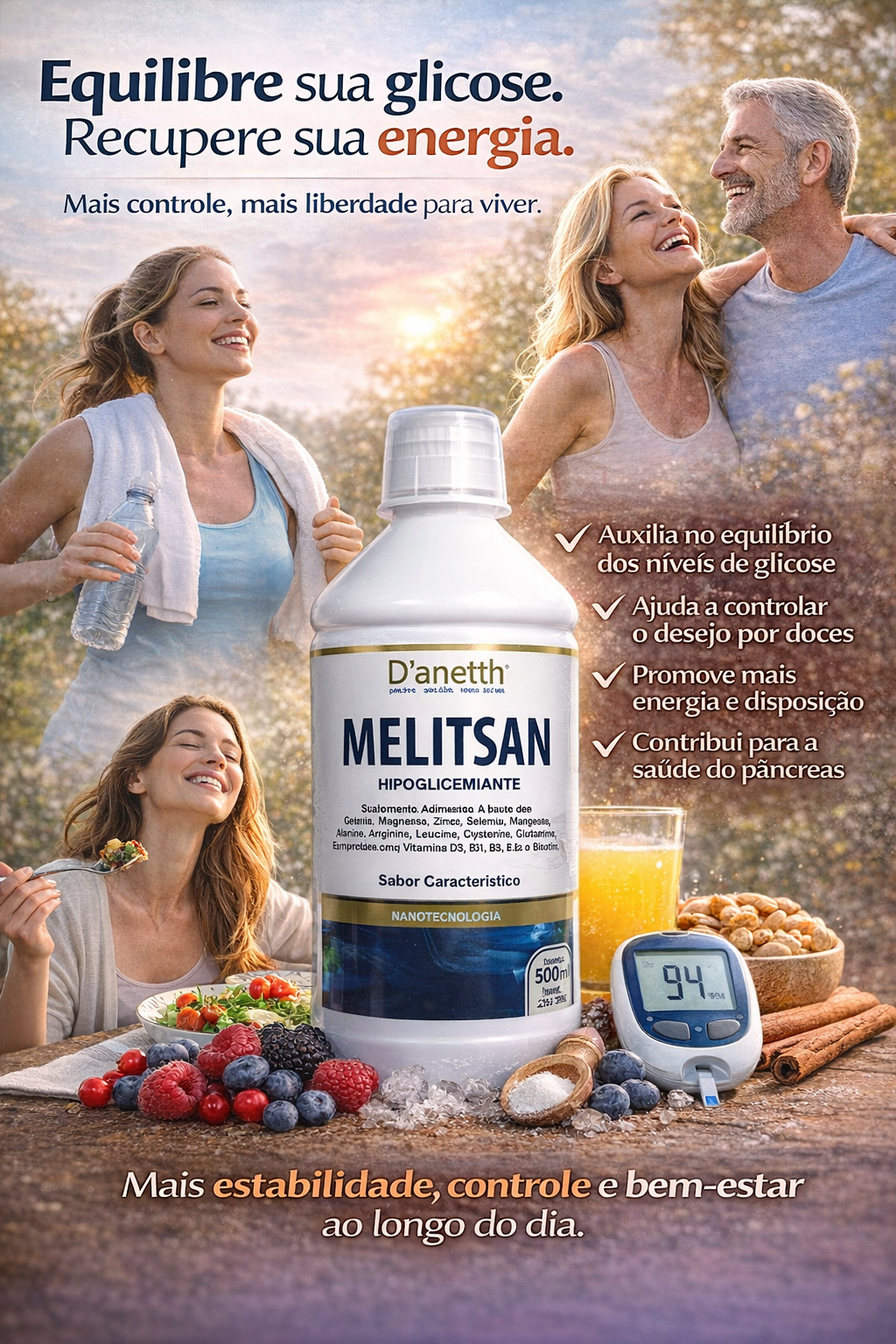 O Melitsan foi desenvolvido com uma combinação inteligente de minerais essenciais, aminoácidos e vitaminas que auxiliam o organismo a recuperar o equilíbrio metabólico natural, ajudando o corpo a utilizar melhor a glicose e a manter o funcionamento saudável do pâncreas.